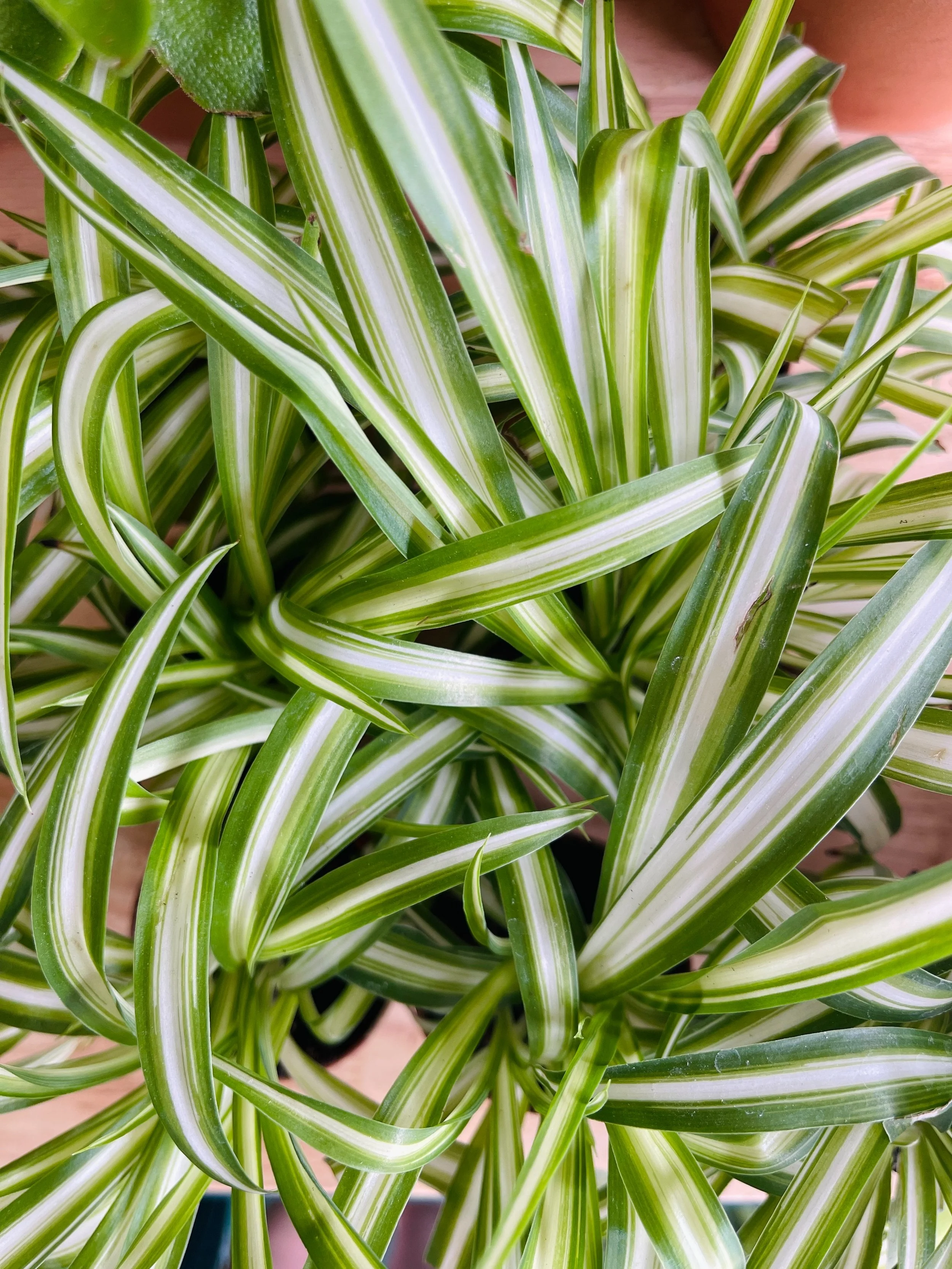 If you’re looking for a plant that grows quickly and can work indoors and outdoors, the spider plant is for you. They love to be moved to a shady porch in the warmer months, but will thrive just as well in your home. Spider plants require bright indirect light and are not tolerant of direct light. You can water them once half the soil has dried. During the growing season (spring and summer for most houseplants),your spider plant will produce little white flowers that will grow into little pups!